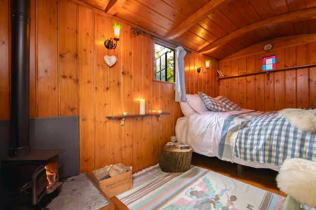 The Shepherd's Hut is cosy and romantic, with beautiful furnishings. There is a king-size bed, with super comfy mattress and luxury cotton bedding. The log burning stove warms the whole hut quickly. During the summer months the shade from the oak trees keeps the hut cool. There is plenty of space for luggage and lots of hooks for hanging clothes.