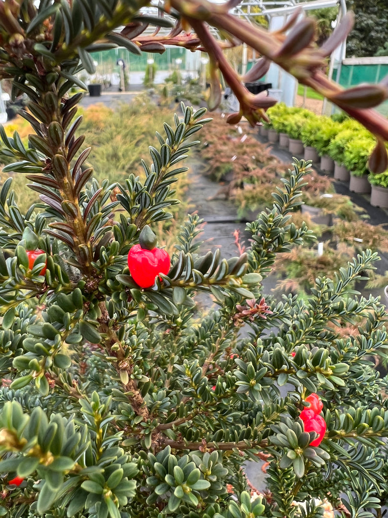 Hand grafted and propagated at Lime Cross Nursery Podocarpus 'Red Embers' is a dwarf conifer, irregularly shaped, producing yew-like foliage. New foliage emerges orange to red, then changes to a deep maroon purple in winter. This female variety will produce red berries in the winter, if pollinated.
